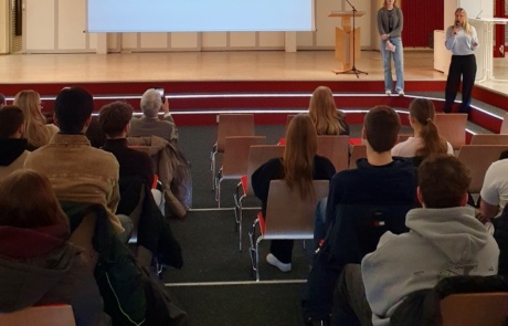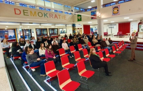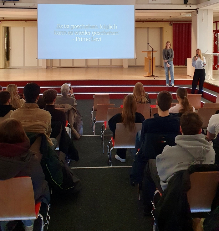 In der Agorà wurden die Schülerinnen und Schüler zunächst von Schulleiterin Frau Warns und von Bürgermeister Michael Kurz begrüßt. Eindrücklich wurde auf die Relevanz des Gedenktages und des Erinnerns hingewiesen. Meira und Lisa (aus dem 13. Jahrgang) hielten anschließend einen sehr ansprechenden Vortrag über die Genese des Gedenktages.